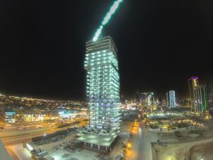 At an accelerated pace, and according to the schedule of construction work in Al Resayes Tower, all construction work is almost completed, knowing that the work of glass facades has begun.